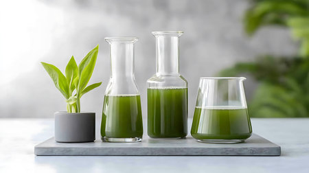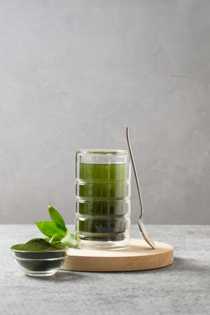 Chlorella healthy beverage on a grey background.
