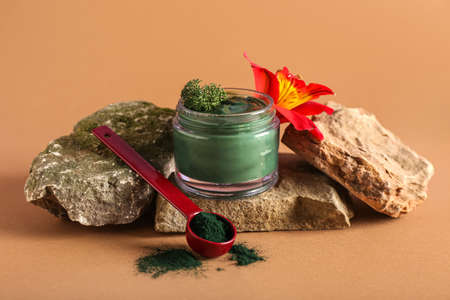 Composition with jar of spirulina facial mask, powder and stones on color background