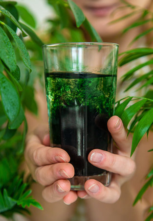 A woman drinks liquid chlorophyll. selective focus. Nature.