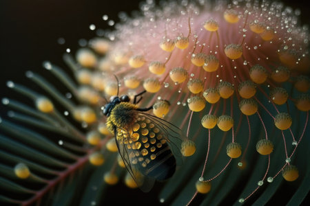 a close-up shot of a delicate mimosa flower, with dew drops on the petals and a bee buzzing nearby., created with generative ai