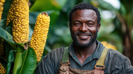 A joyful farmer poses among ripe corn plants in a vibrant agricultural field during sunny weather. The atmosphere is lively and productive.