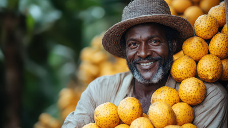A joyful farmer poses with freshly harvested citrus fruits in a lush environment showcasing his pride in the bountiful harvest during daylight.