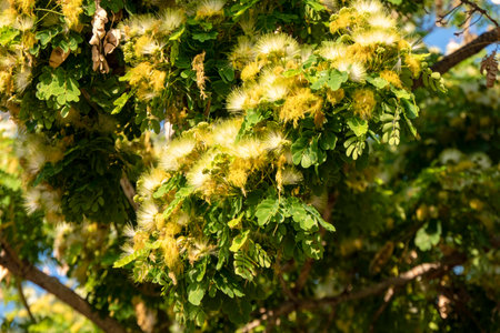 Delicate yellow flowers of Albizia lebbeck or Siris Tree or Woman's Tongue Tree close up