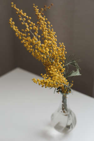 Beautiful yellow mimosa flowers in a vase on a gray background. selective focus.