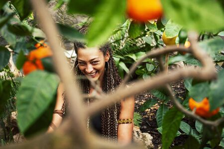 pretty islam woman in orange grove smiling, real muslim girl cheerful , nature organic people concept