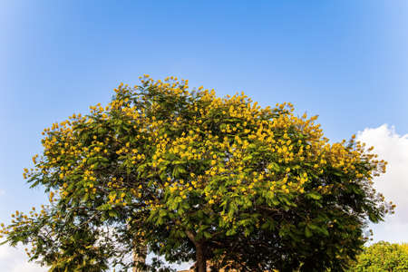 Lush crown of blooming yellow acacia. Tropical park on the shores of Tiberias lake. Israel