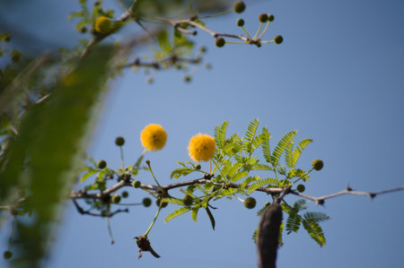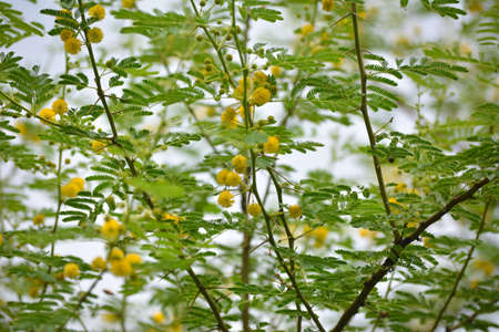Leaves, flowers, buds and pods of the growing Vachellia farnesiana, known as acacia or sponge acacia grown in an organically