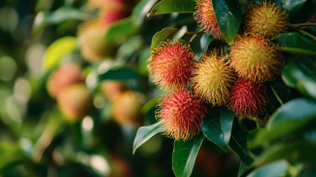 A close-up view of rambutan fruits growing on a tree, showcasing their vibrant colors and spiky exterior. This image captures the essence of tropical agriculture and healthy living.
