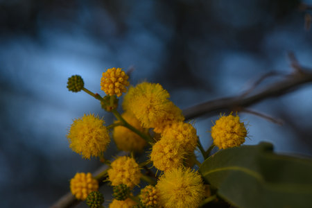 Australian native yellow wattle branches in bloom shot at shallow depth of field