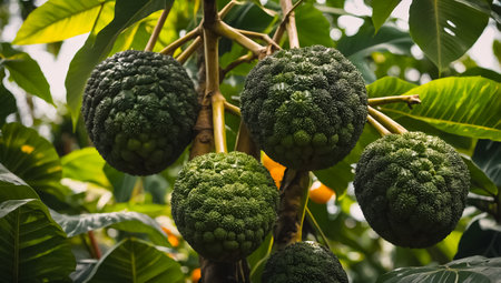 A stunning arrangement of vibrant exotic fruits, including durian and rambutan, on lush green leaves, perfect for a nature-inspired culinary or food design theme.