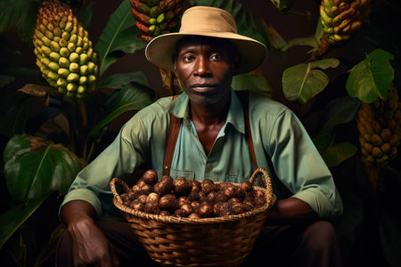 man in brown cap with hat and red polo shirt holding a mango tree, in the style of joyful