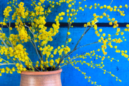 A bouquet of yellow mimosa flowers in a brown clay vase. Yellow spring flowers on wooden blue background. Golden Acacia dealbata in bloom as a gift for Mom's day, March 8, Valentine's day, Easter.