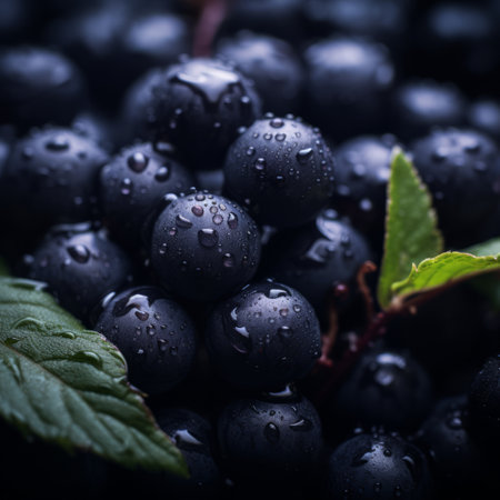 a bunch of black berries with water droplets on them