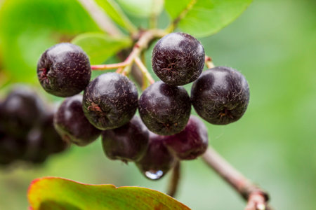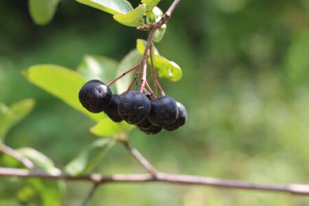berries of a black chokeberry on a branch in garden