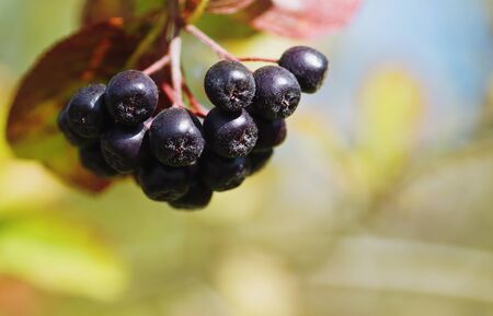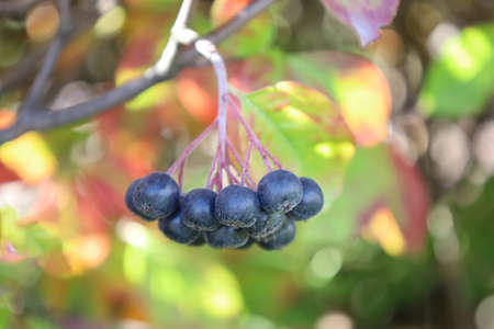 A bunch of chokeberry on a branch. Ripe chokeberry berries in the autumn garden against the backdrop of bright autumn foliage.