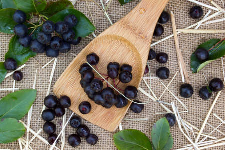 Black chokeberry in a spoon on burlap sack background