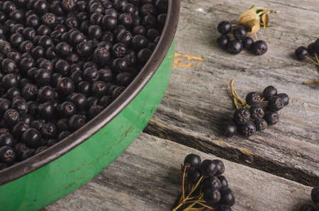 Fruits of black chokeberry prepared for processing. Shallow depth of field.
