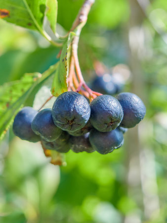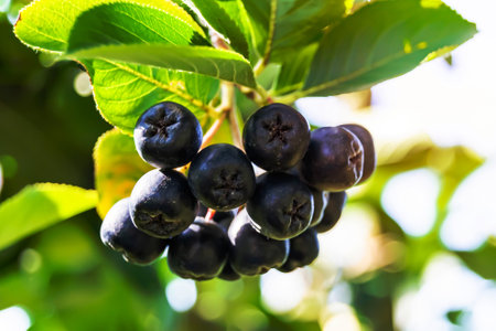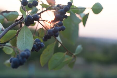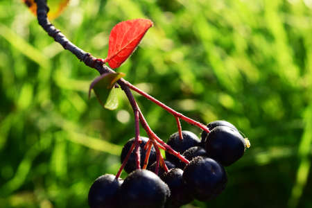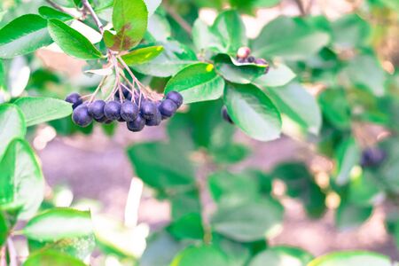 chokeberry Bush branch with dark purple fruit with green fresh leaves on the forest bright summer autumn day lit by the rays of the bright sun.