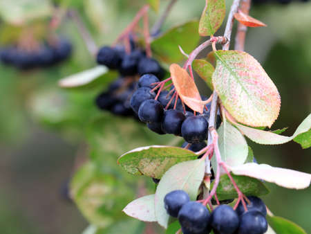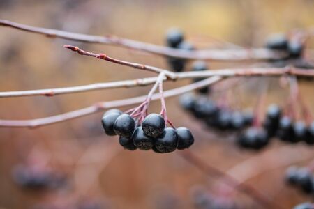 Aronia berries on twig. Aronia melanocarpa. Black Chokeberry in the autumn. Interesting nature concept for background design. Soft focus. Harvesting time