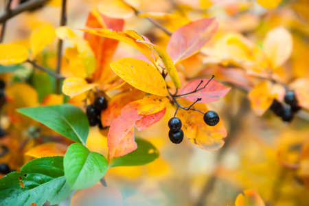 Chokeberry bush in autumn with berries and yellow and red leaves