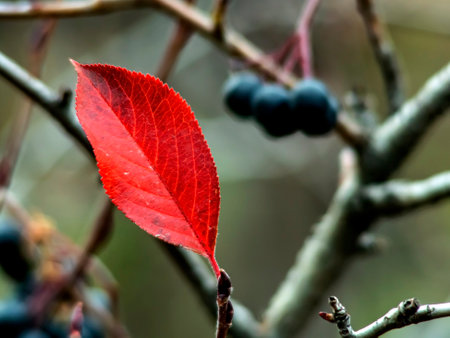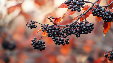 black rowan berries on branches with red leaves on an abstract background of autumn