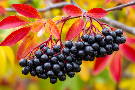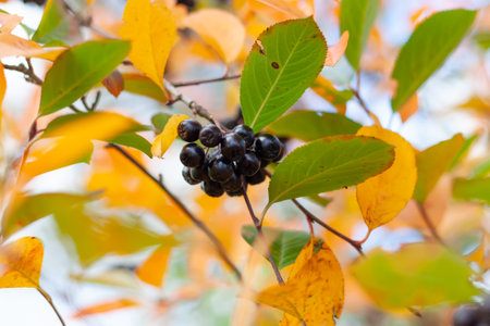 Aronia berries hanging on a branch with colorful autumn foliage