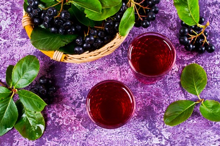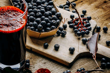 Fresh aronia berries and berry juice in a glass