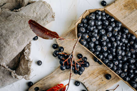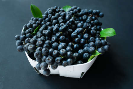 Chokeberry or Aronia melanocarpa on ceramic background. Copy space for text.