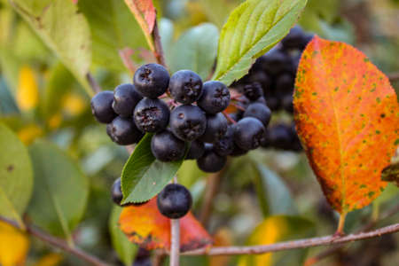 Ripe aronia on a bush with red and green leaves