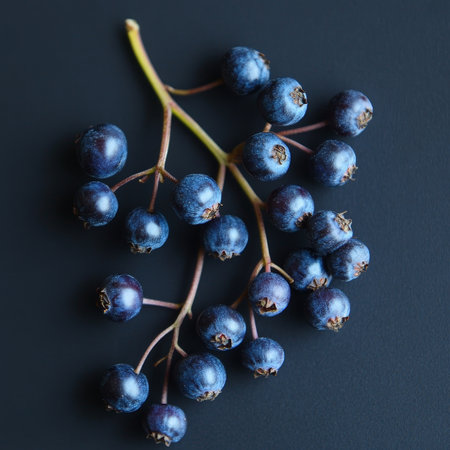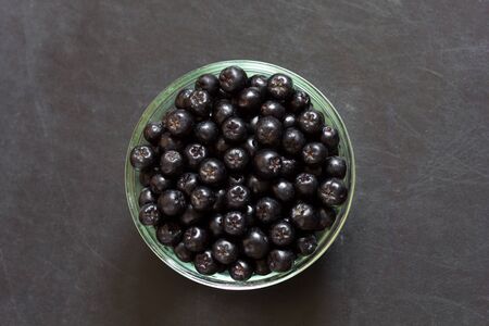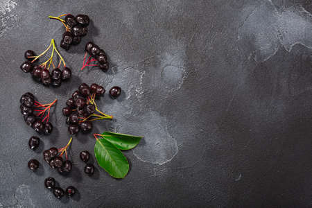Black chokeberry (Aronia melanocarpa) berries atop dark textured backdrop w/ copy space, top view