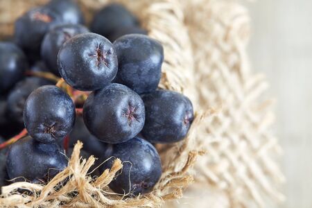 Aronia berries (black chokeberry) in burlap sack. Top view with copy space