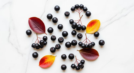 Colorful autumn arrangement with aronia berries and leaves on white surface