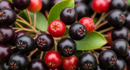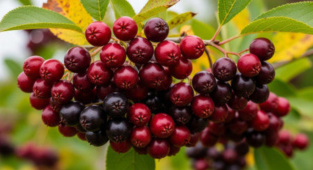 Ripe black chokeberries hang on a branch adorned with fresh green leaves, contrasting with the red unripened fruit, under a soft shallow depth of field. Perfect nature and botanical photography theme.