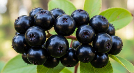 Close-up of glossy black aronia berries on vibrant green leaves