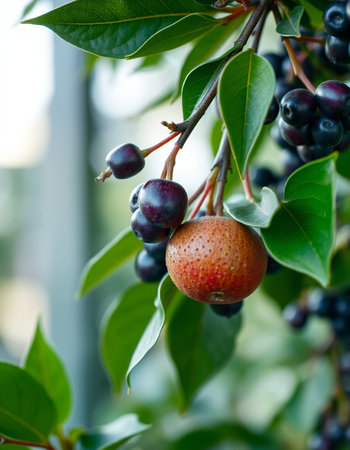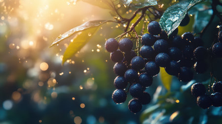 Berries dangle from vibrant green leaves, their surfaces glistening with raindrops. The soft sunlight filters through, casting a warm glow in the lush surroundings.