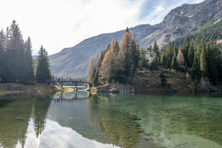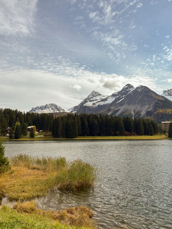 Arosa, Switzerland, October 12, 2024 Pretty lake with snow covered alps in the background in autumn