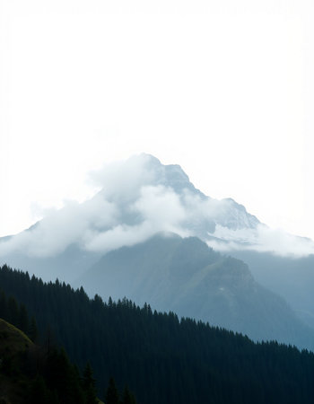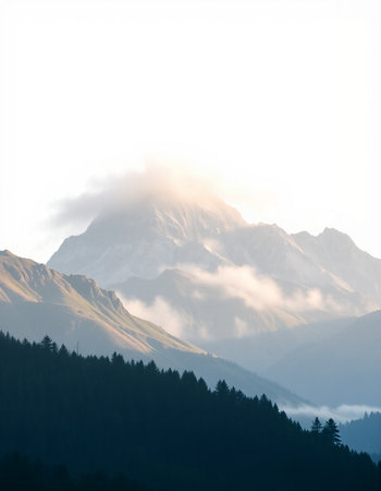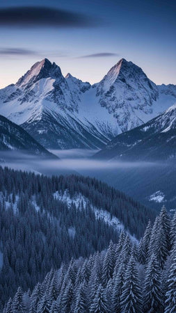 Serene winter landscape featuring snow-capped mountains at sunrise, with a foggy valley and evergreen forest in the foreground, evoking a sense of tranquility and natural beauty.
