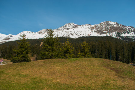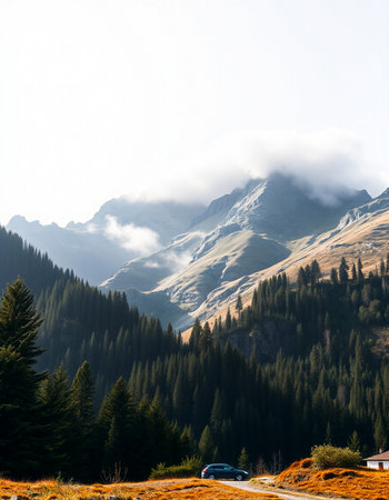 Beautiful mountain landscape with snow-capped peaks and coniferous forest
