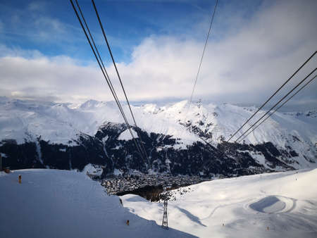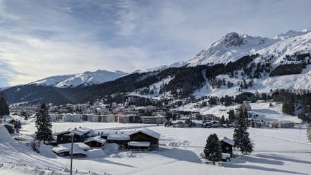 view into the valley of Davos Dorf including Parsenn with blue sky and plenty of snow