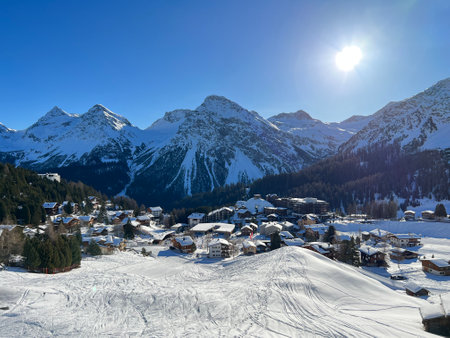 Beautiful sunlit and snow-capped alpine peaks above the Swiss tourist sports-recreational winter resort of Arosa - Canton of Grisons, Switzerland (Schweiz)