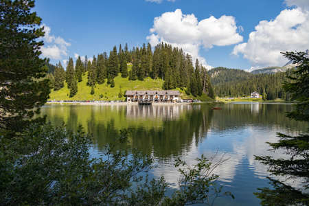 LAKE MISURINA, VENETO/ITALY - AUGUST 9 : View of Lake Misurina near Auronzo di Cadore, Veneto, Italy on August 9, 2020. Unidentified people