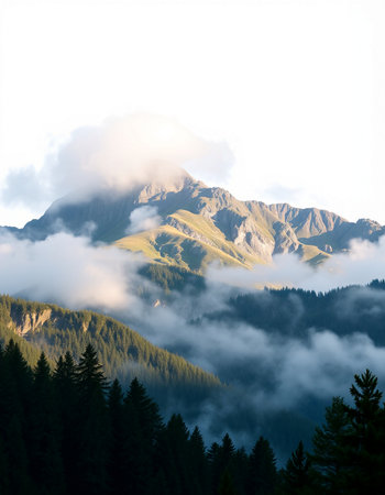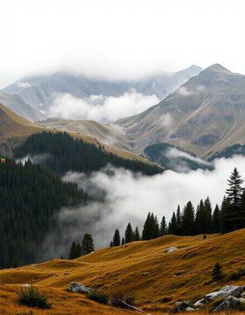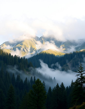 Mountain landscape with fog and coniferous forest in the foreground