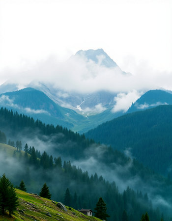Foggy mountain landscape in Dolomites, South Tyrol, Italy