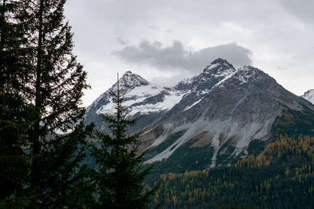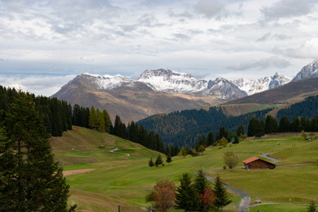 Arosa, Switzerland, October 12, 2024 Alpine panorama view with snow covered mountains in autumn