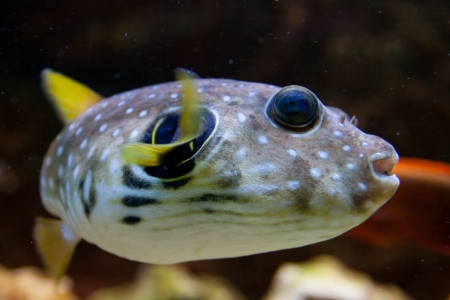 Macro shot of porcupine fish swimming in fishtank. Dangerous wild marine animal.