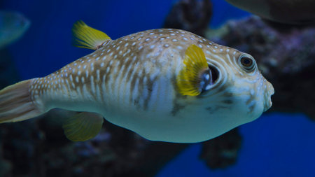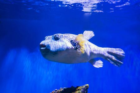 Porcupine pufferfish at the aquarium on the blue background. Marine fish concept Ichthyology concept