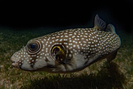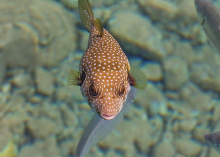 puffer fish with round eyes and white dots on brown skin swims in sea