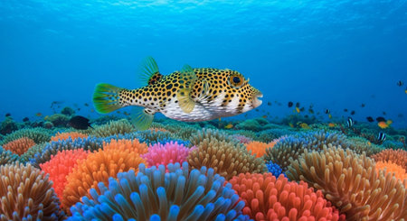 A vibrant puffer fish is swimming through a lively coral reef, showcasing its unique colors and patterns. The underwater habitat is rich with diverse marine life.