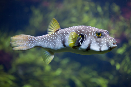 Fugu puffer blowfish fish Arothron Hispidus in aquarium as nature underwater sea life background