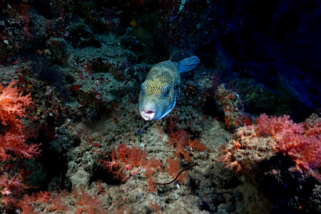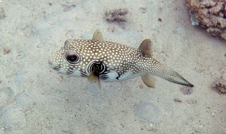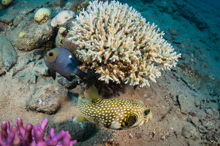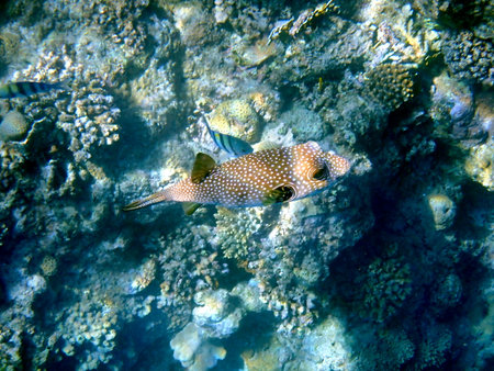 white spotted puffer fish swims in clear water over the corals in egypt